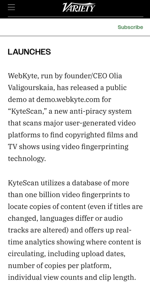 WebKyte has been featured in Variety following the launch of its public KyteScan demo, marking an important step in making its content protection technology more accessible.